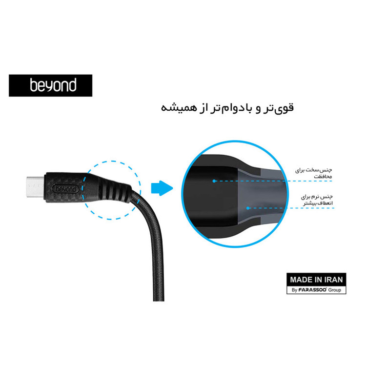 کابل شارژ MicroUSB مدل BA-300 بیاند از جنس رشتههای مسی ساخته شده است. این کابل کاملاً استاندارد بوده و به دلیل جلوگیری از جریانات مرتعش، در استفاده طولانی مدت به باتری دستگاه شما صدمهای وارد نخواهد کرد.کابل بیاند BA-300 دارای یک روکش بافته شده از الیاف نایلونی است تا دوام بالاتری نسبت به کابلهای لاستیکی داشته باشد و با استفاده مداوم دچار بریدگی یا تاشدگی در طول کابل نشود.جنس هسته این کابل از مس است و وجود ۴ مجموعه سیم مسی در این کابل باعث میشود که علاوه بر شارژ سریع دستگاه با جریان ۲A، قابلیت انتقال اطلاعات به کمک آن را نیز داشته باشید.با این کابل میتوانید تمام دستگاههایی که دارای ورودی Micro-USB هستند را شارژ کنید و یا با اتصال به کامپیوتر بین آنها به انتقال فایل بپردازید.